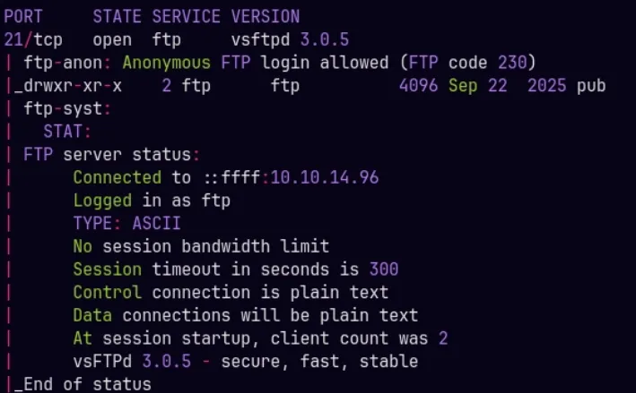 Se observa que tenemos el puerto 21 FTP abierto y que tenemos acceso como el usuario anonymous, con esto, validamos: