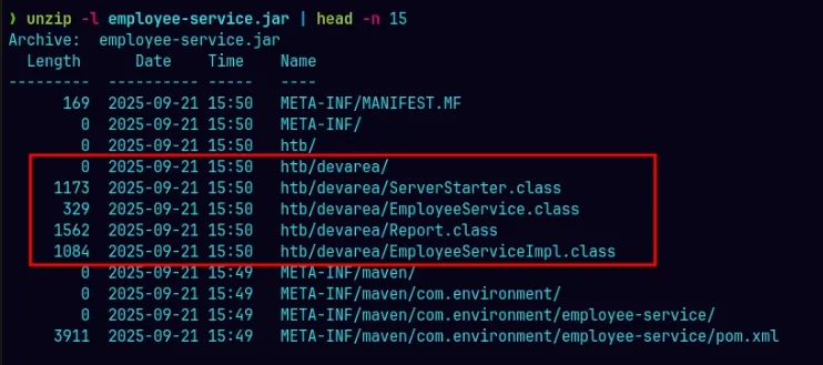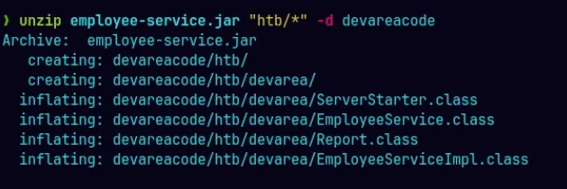 Para extraer estos archivos, inidicaremos a UNZIP que del comprimido employee-service.jar solo extraiga todo lo que se encuentren dentro de el directorio “htb” en el directorio “devareacode”