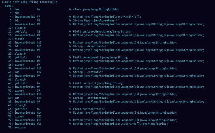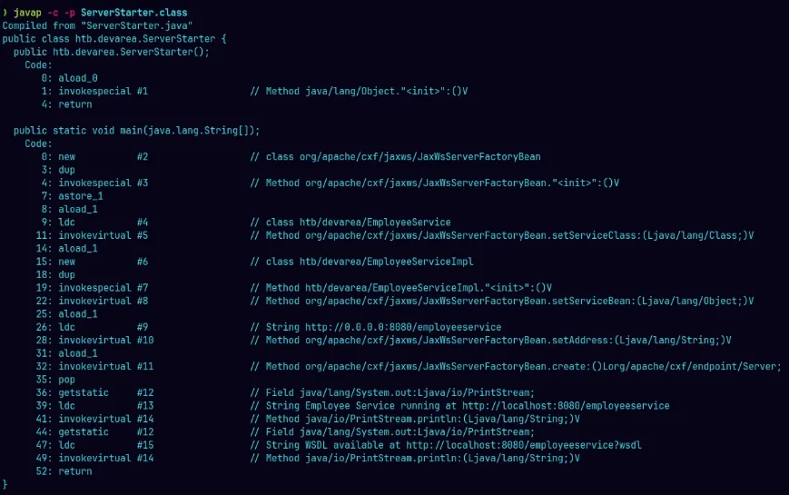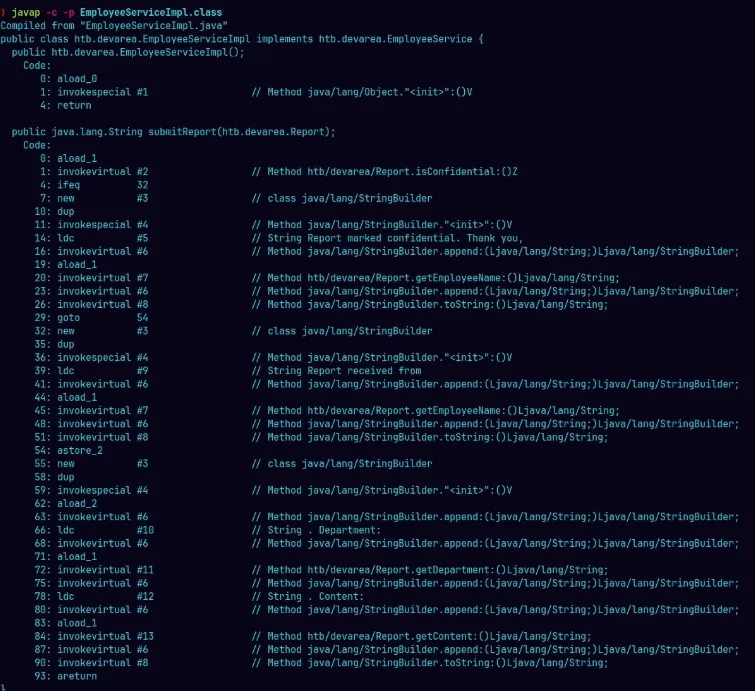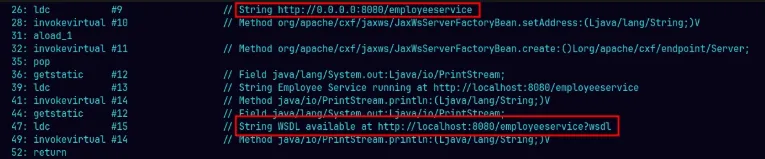 Si observamos desde la linea 26 hasta la 52, vemos que existe una carga de tipo string con la ruta http://0.0.0.0:8080/employeeservice, realizado por el OPCODE “ldc”